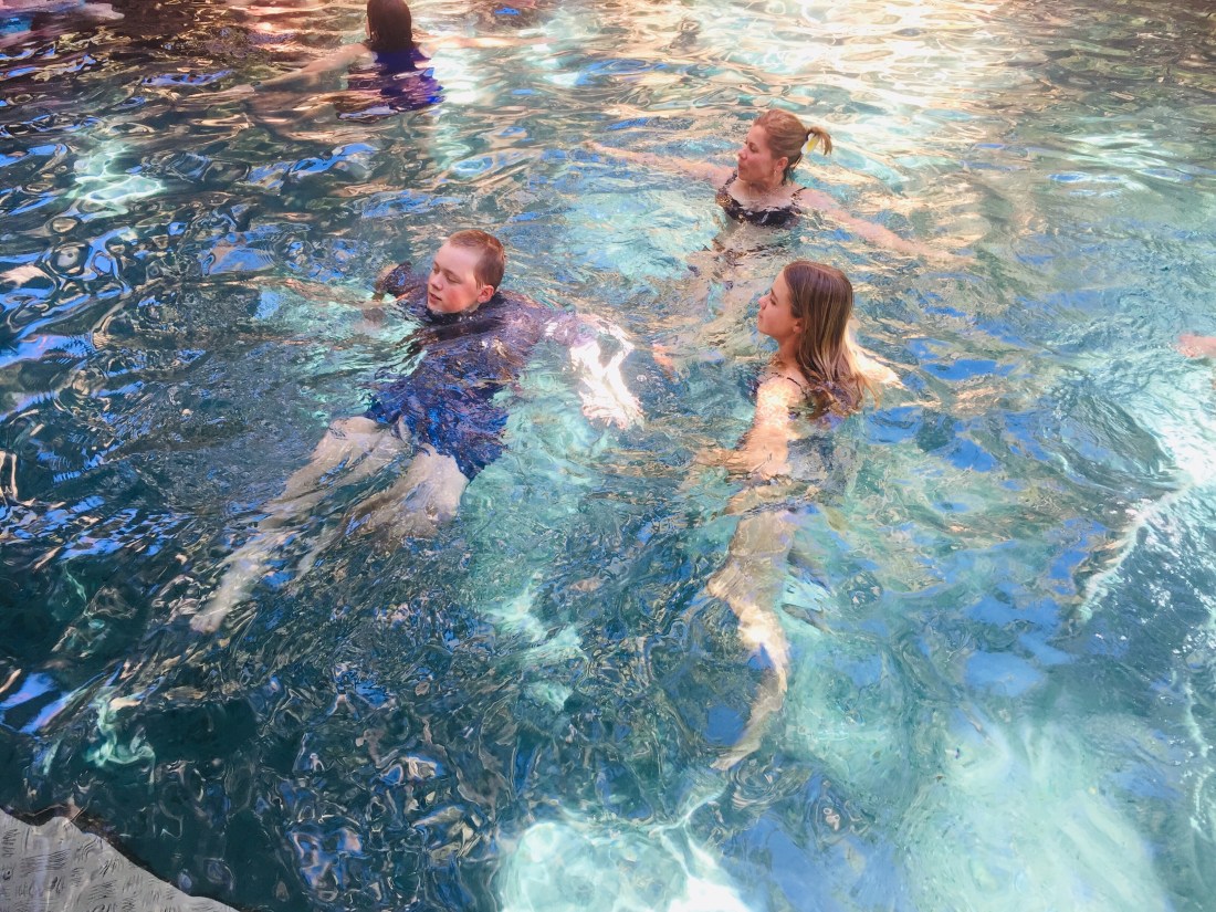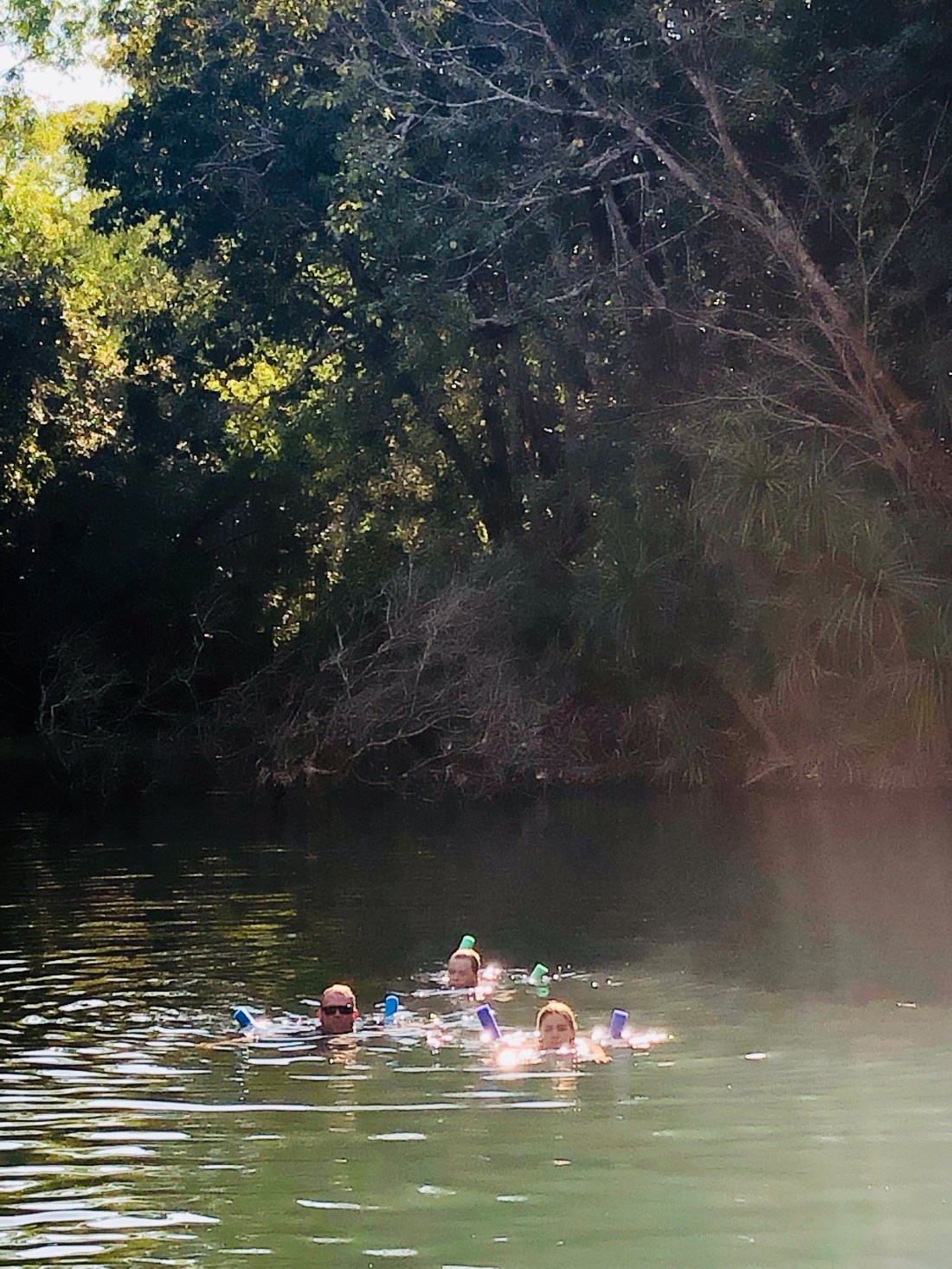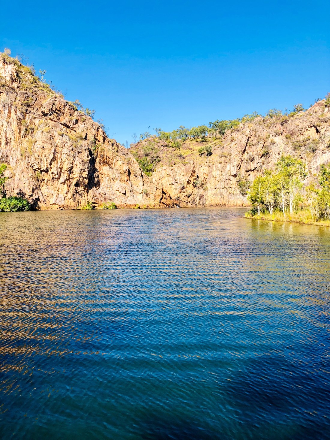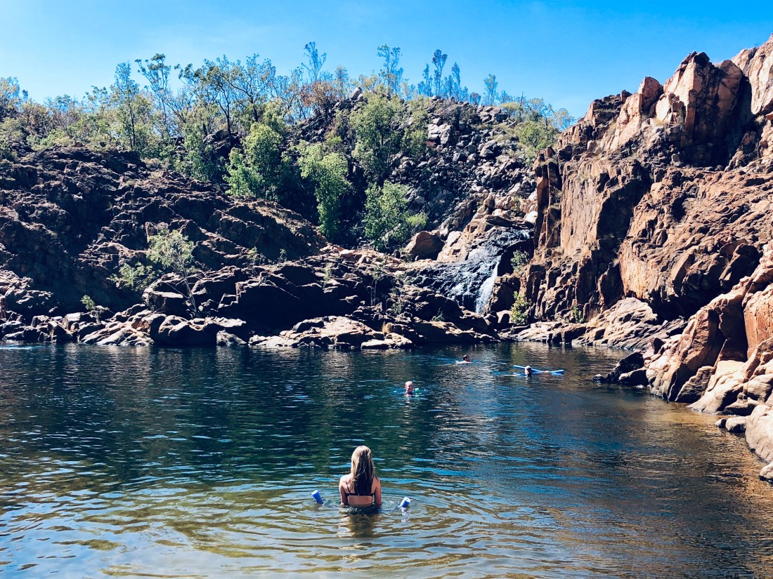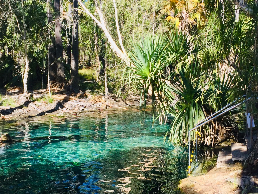 Mataranka was our least favourite. It was basically the size of a large swimming pool and surrounded by palm tree detritus. It was the warmest of the 3, because it was the smallest area and the water was very still. It was also the most popular- a very safe environment for families with small children and older visitors who may have difficulties getting to places off the beaten track. Katherine Hot Springs had separate pools and there was a better water flow bringing the temperature down a few degrees… which in fact was much more pleasant. Being the dry season the water was quite low in places and you had to scramble over the rocks in shallow water to get to the next pool. Bitter Springs was the best of the three. It had a nice current and good depth- you could enter the water at one end, float down the length of the Springs, climb out the other end and repeat!